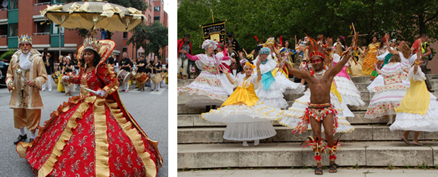 unten: MARACATU Nation Stern der Elbe mit Gästen beim Umzug zu den Landungsbrücken